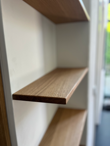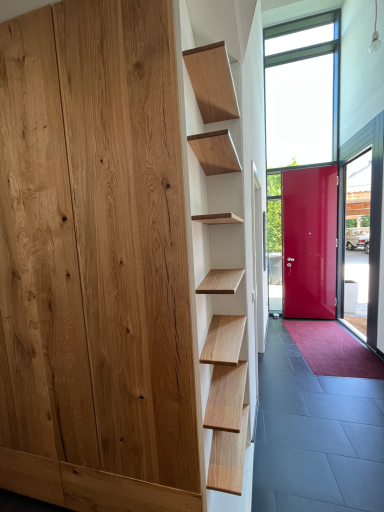 Um das einzufangen und in das Möbelstück zu integrieren, lauft die rechte Seite mit der Wand mit und verlängert sie. Durch die nach hinten springende rechte Seite und dem Regal wirkt der Raum einladender.