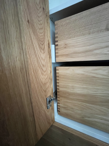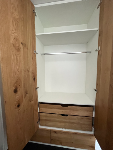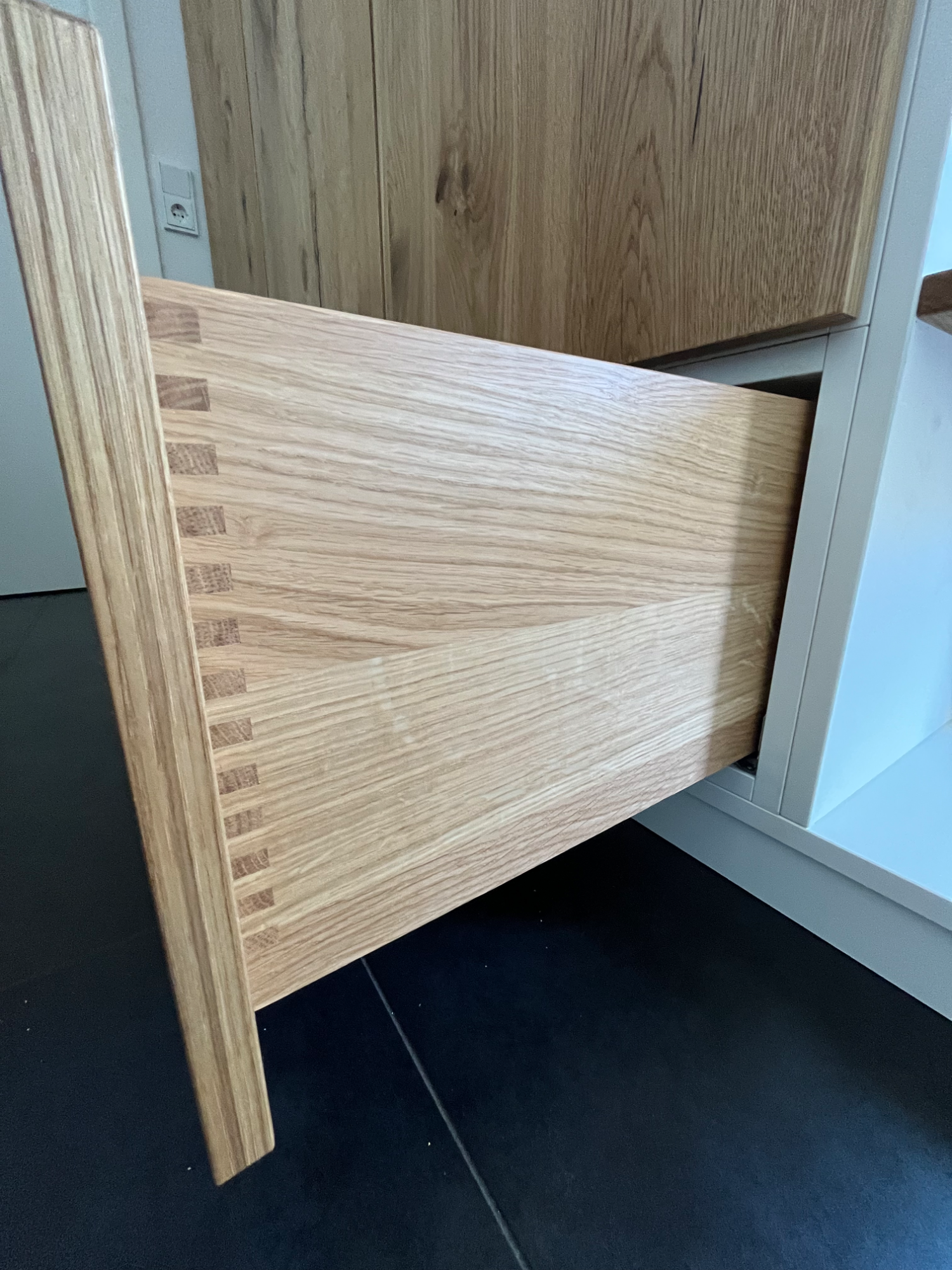 Der Schrank ist in schlichten Weiß gehalten und bringt durch die geölten Eiche-Furnierten Fronten und den Einlegeböden und Schubkästen aus massiver Eiche