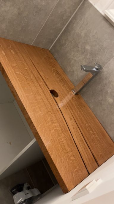 Dieses stilvolle Waschtisch-Ensemble wurde speziell für den Einsatz im Gäste-Bad gestaltet. Die geölte Eichenholzplatte besticht durch ihre markante Spiegelmaserung, die dem Möbelstück eine einzigartige, lebendige Optik verleiht.