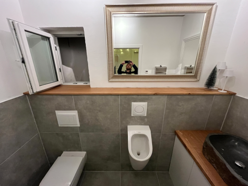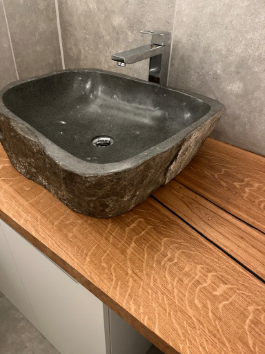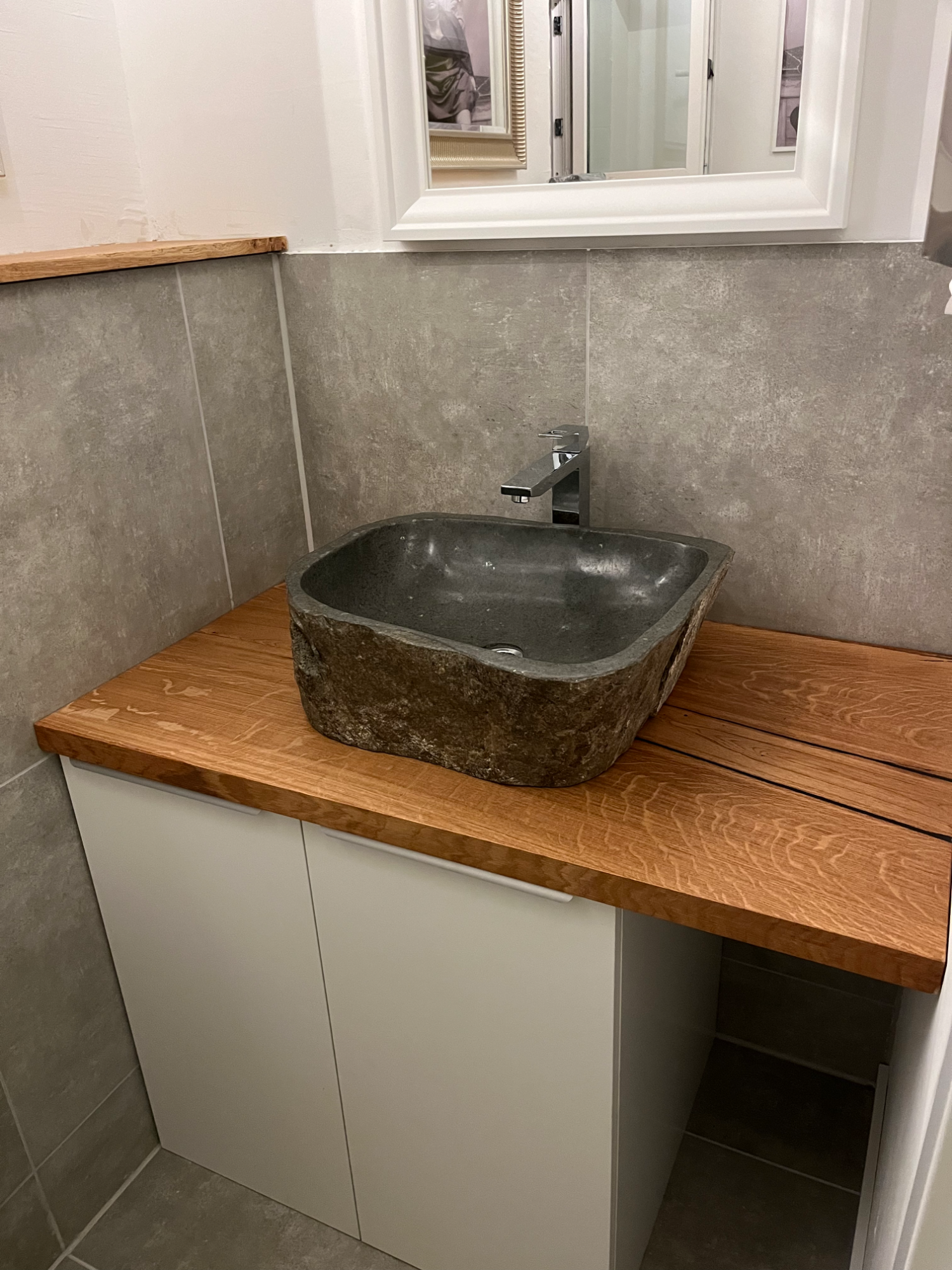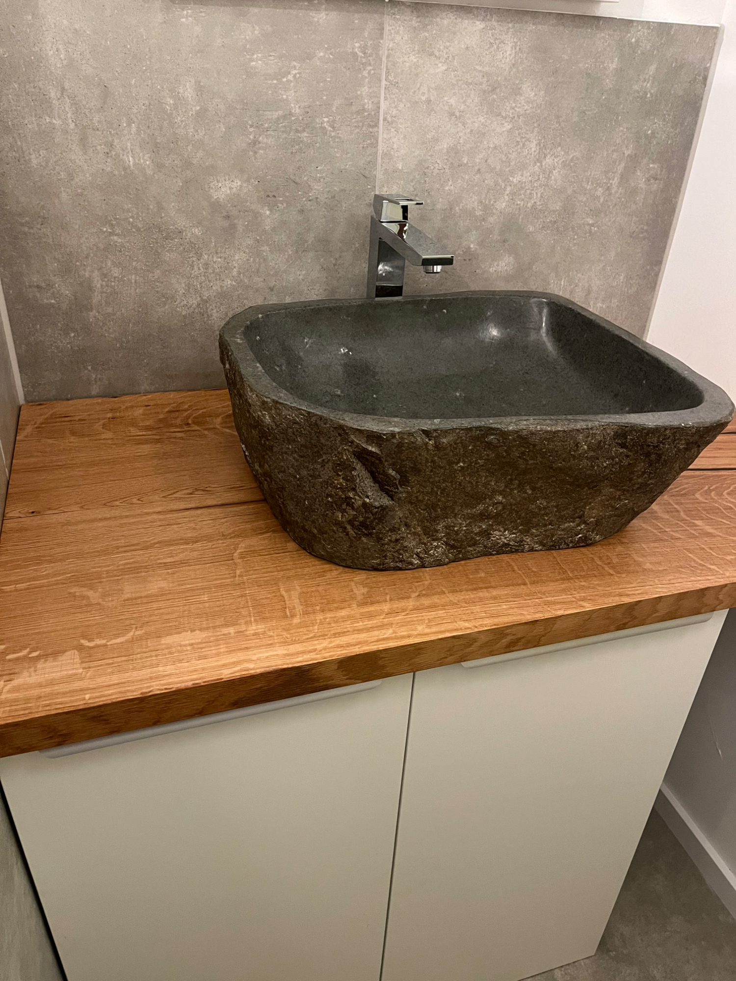 Darauf sitzt ein massives Naturstein-Waschbecken, das mit seiner rohen, organischen Form einen harmonischen Kontrast zur warmen Holzoberfläche bildet. Die geölte Behandlung betont nicht nur die natürliche Struktur des Holzes, sondern schützt es auch zuverlässig vor Feuchtigkeit.