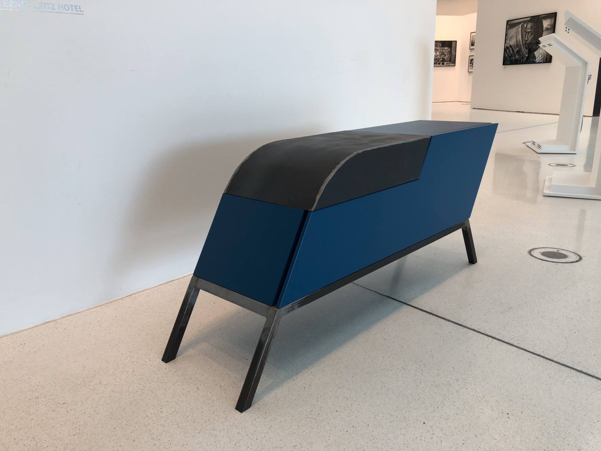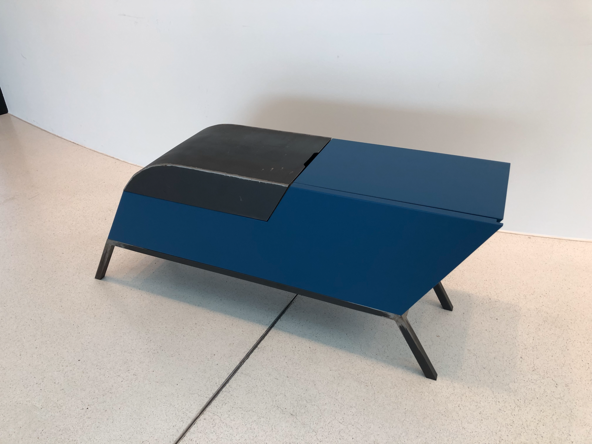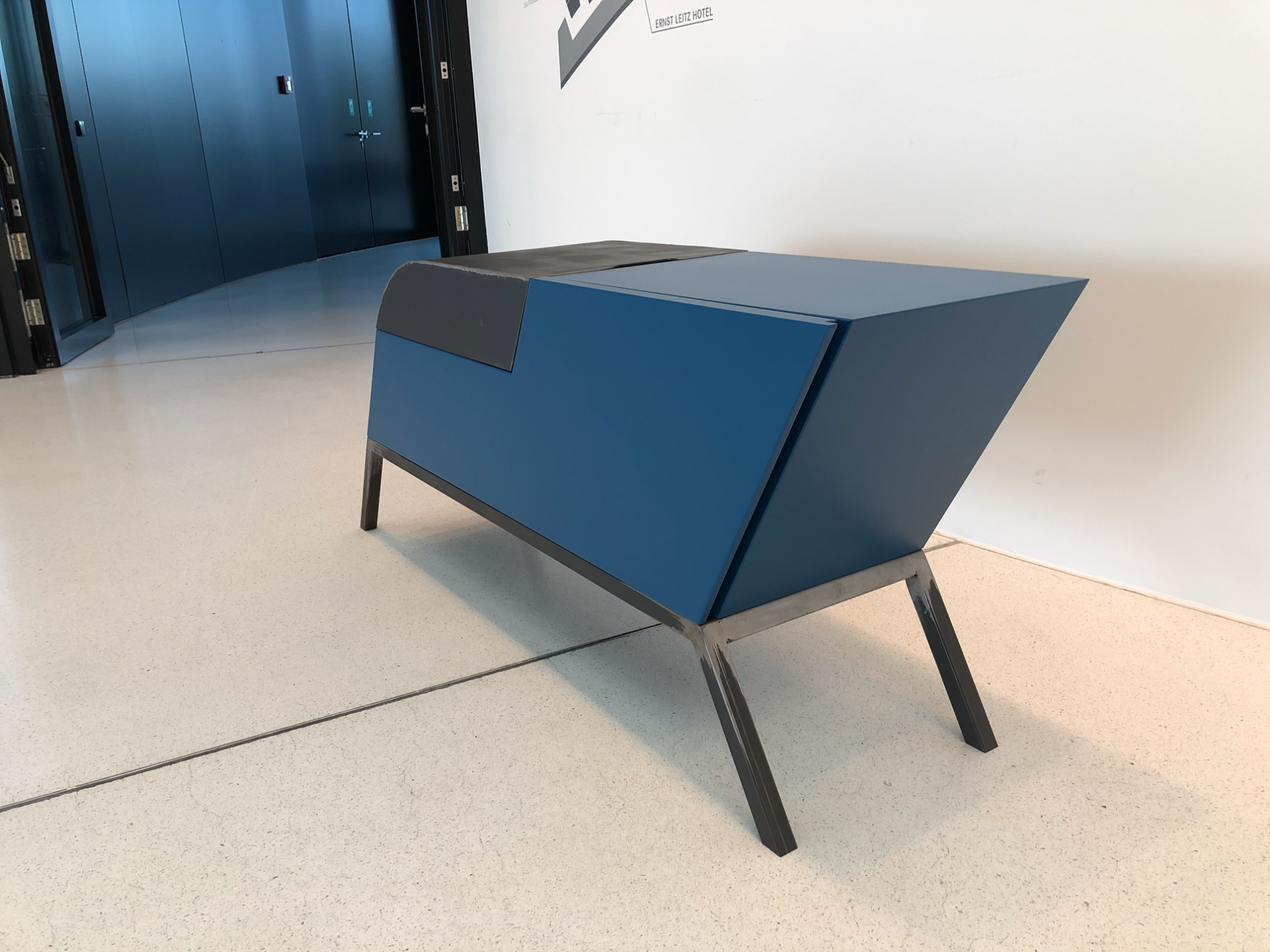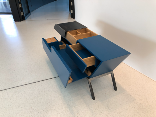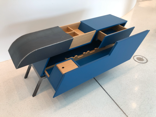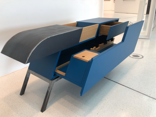 Das Weinboard ist ein außergewöhnliches Möbelstück, das modernes Design mit funktionaler Handwerkskunst vereint. Gefertigt aus lackierten MDF-Platten, Eiche und Stahl, überzeugt es durch seine markante Form und die Kombination unterschiedlicher Materialien. Die klaren Linien und der tiefblaue Farbton verleihen dem Stück eine zeitgenössische Eleganz, während die warmen Holzelemente einen harmonischen Kontrast schaffen. Das Weinboard bietet vielseitige Aufbewahrungsmöglichkeiten mit präzise gearbeiteten Schubladen und Fächern, die sowohl praktisch als auch ästhetisch ansprechend gestaltet sind. Durch die robuste Stahlkonstruktion erhält das Möbel Stabilität und einen industriellen Charakter, der es zu einem besonderen Blickfang in jedem Raum macht.